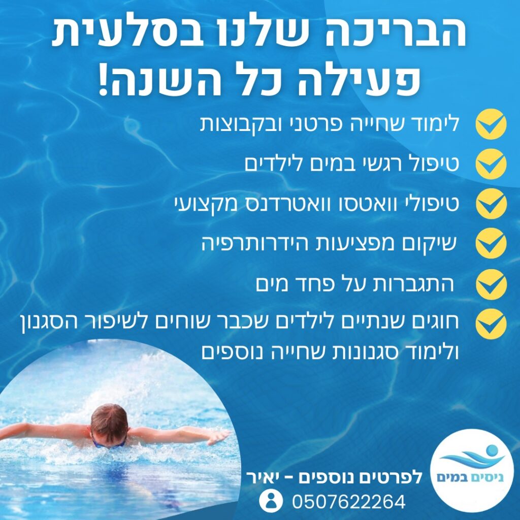 ניסים במים-בית ספר לשחייה, לומדים את כל הסגנונות, התגברות על פחד מים, שיפור מיומנות השחייה, נהנים מהחוויה תוך כדי למידה, טיפול ריגשי, טיפול הידרותרפיה, שיקום מפציעות, וואטסו ועוד, מאמן ומטפל מוסמך ומנוסה גם עם ילדים עם צרכים מיוחדים והפרעות קשב וריכוז.